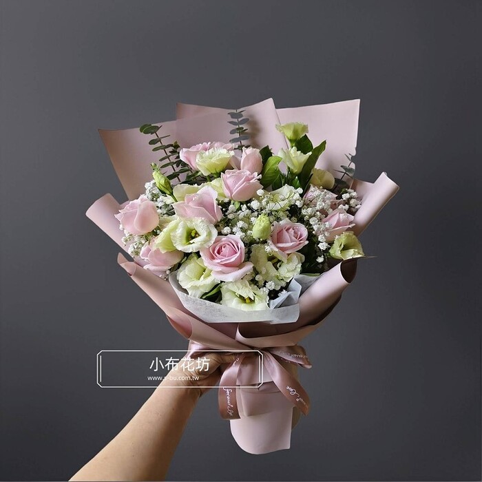 花材:粉玫瑰 綠桔 季節葉材