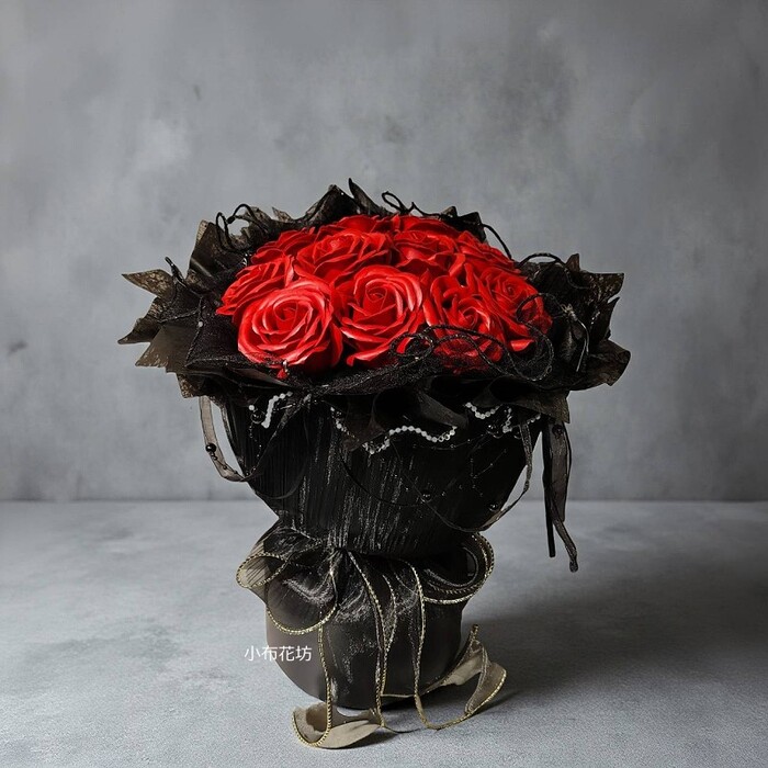 花材:香皂花11朵 含LED燈 尺寸:約高33公分 寬25公分 手工包裝尺寸+-3公分 (花材,包裝紙如有缺貨以現有花材替代) 花材:鬱金香 玫瑰香皂 乾燥花 、人造葉。LED燈紗網 香皂花,用特殊的生產技術將香皂材料做成薄片的花朵形狀。 成分:天然植物精華、香精油、甘油。 (如遇到包裝材料缺貨時,請允許設計師稍作更改)。