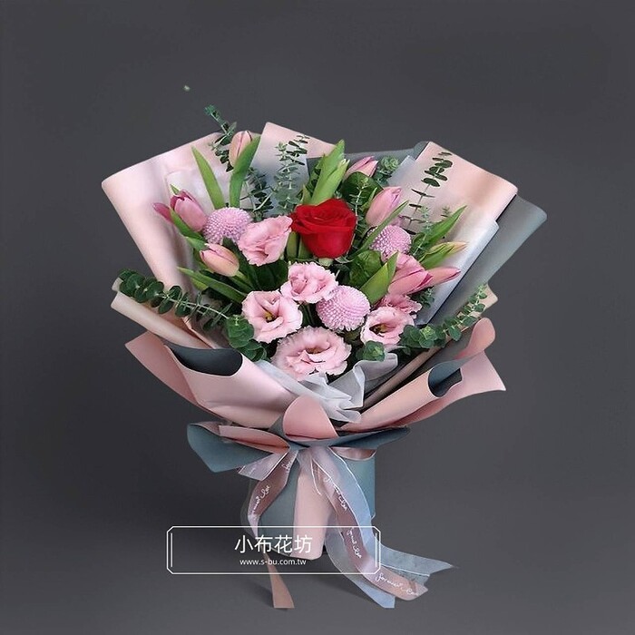 花材: 進口紅玫 粉鬱金香 粉乒乓 粉桔梗 季節葉材