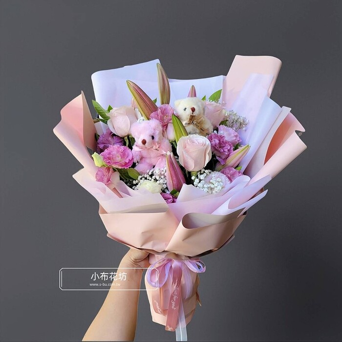 玩偶2 隻 百合 進口粉玫3朵 粉桔梗 季節葉材